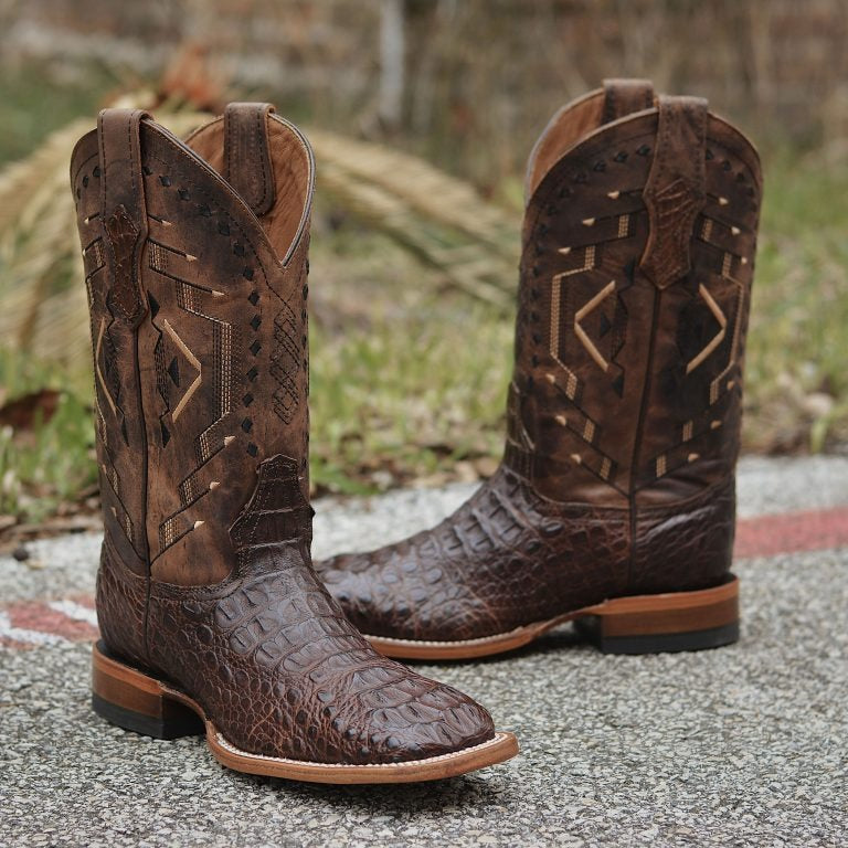 Exotic Caiman Hornback Tobacco Square Toe Boots