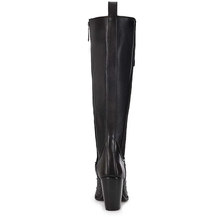 Women's tall boot in cowhide leather. Features laser engraved geometric pattern, genuine crystals, metal studs and subtle perforations.